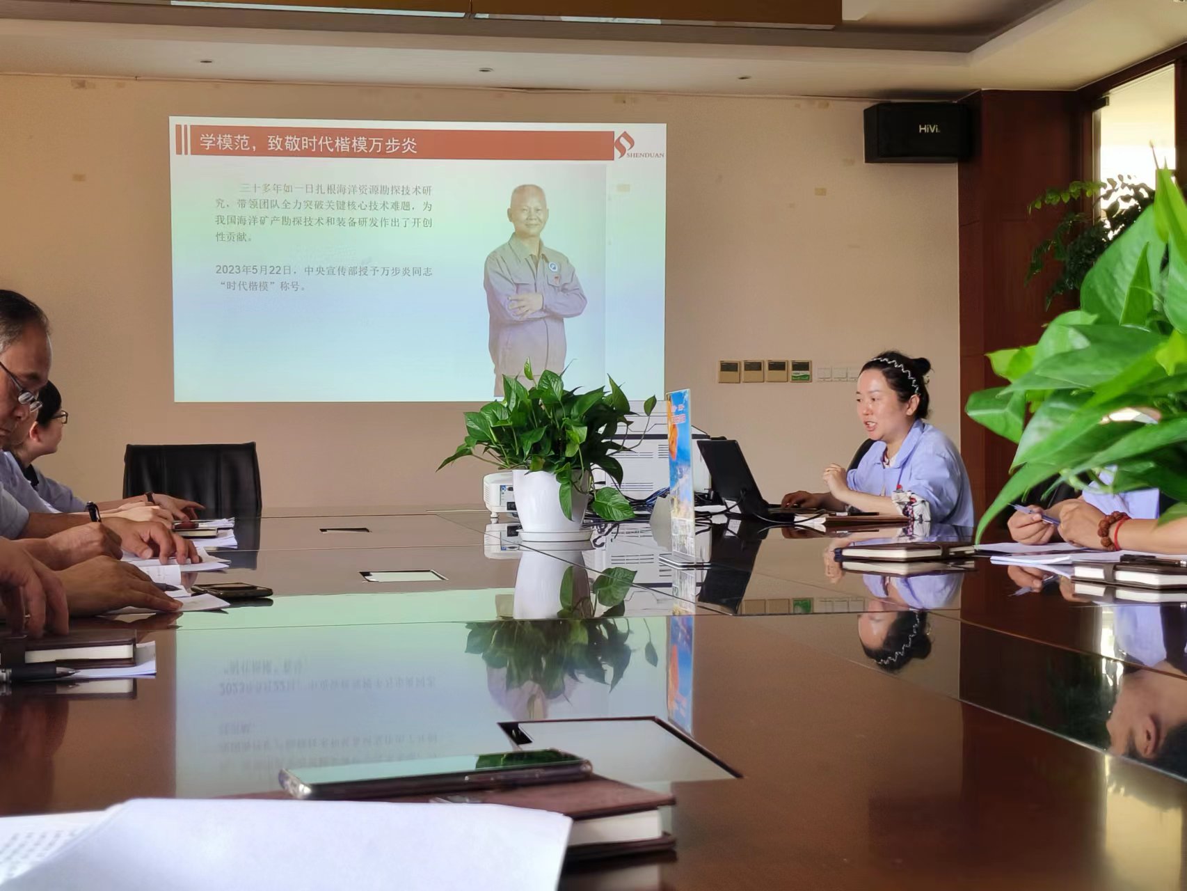 首先,“學模范,致敬時代楷模萬步炎”,通過視頻介紹,學習萬步炎同志的“愛國奉獻,勤奮刻苦”的精神,引導員工“愛崗敬業、拼搏奉獻”,敢于擔當,勇于擔當,不斷進取。