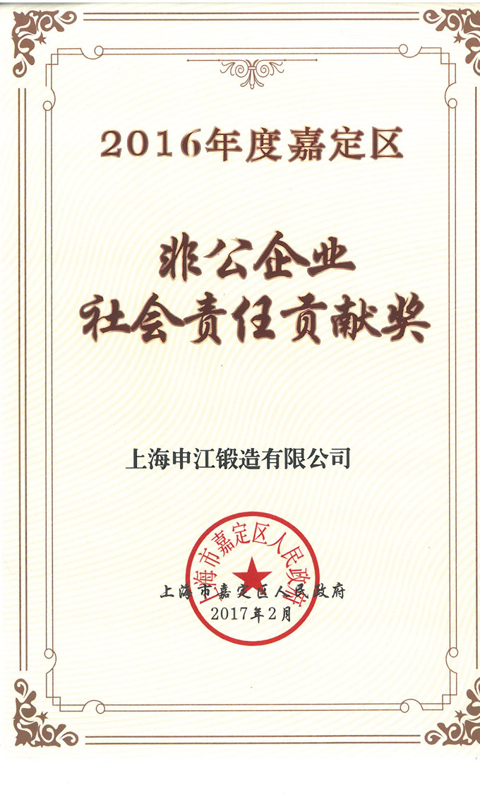 立足企業(yè)文化 ,履行社會責任。近日,嘉定區(qū)人民政府授予我司“2016年度嘉定區(qū)非公企業(yè)社會責任貢獻獎”榮譽。
